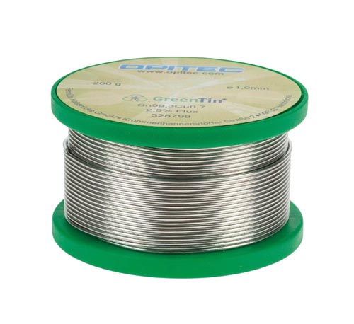 Sn99,3Cu0,7 (ISO 9453 Leg.Nr. 401) conține un material conductor moale din staniu, argint și cupru. Temperatură de topire 227 °C, cca. ø 1 mm.