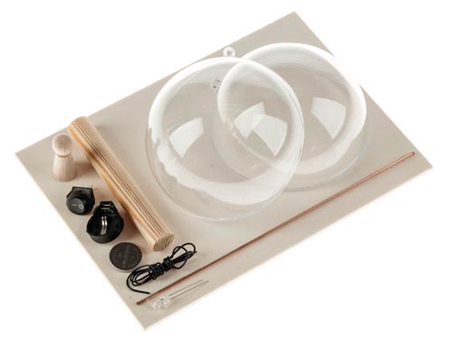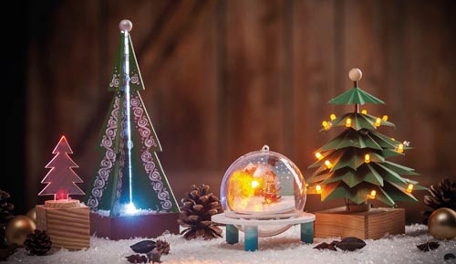 Pachet contrucție de crăciun, care se poate agăța. Necesită baterie (CR 2032) care se inclusă în pachet. Proiectul implică următorii pași: marcare, tăiere cu traforaj, șlefuire, lipire, sudare și îmbinare. Descriere în limba germană, model cca. ø 100 mm