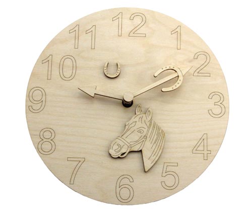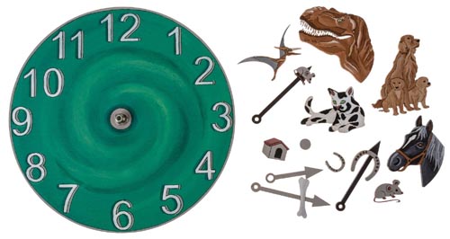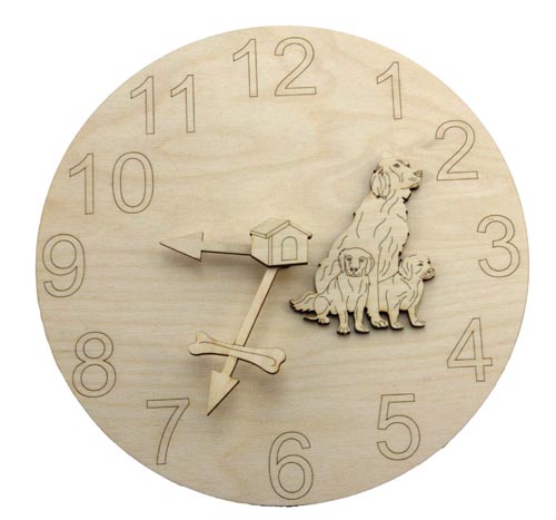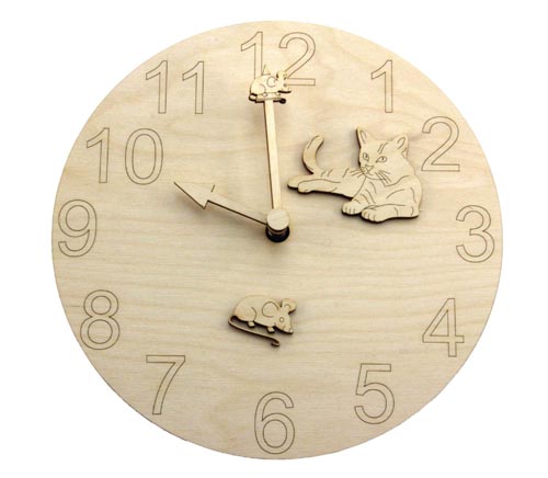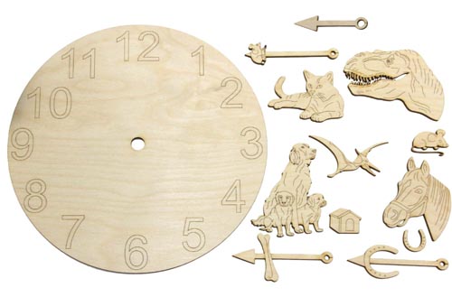 4 modele: cal, câine, pisică și dinozaur. Acele sunt incluse în pachet. Se poate orna mai departe cu cifrele 119262. Cadran din furnir de mesteacăn, grosime 3 mm. Mecanismul de ceas (120081) nu este inclus în pachet, se comandă separat.
