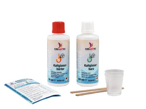 Lazur rece transparent din două componente, rezistent la intemperii și UV, se poate utiliza în mașina de spălat vase, rezistent la frecare și apă. După amestecarea celor două componente (rășină : întăritor în raport 1:1), se întărește devenind neted tip oglindă, creând o suprafață rezistentă la zgârieturi. Se poate aplica pe suprafețe de lemn, ceramică, metal, ipsos, polistiren, beton și alte suprafețe asemănătoare. Poate fi folosit ca strat de lac transparent sau colorat (vopsea acrilică, alcool). Grosime maximă strat: 2 cm. Calcularea cantității necesare: lățime model x lungime model x 0,158 = cantitate de lazur necesar exprimat în ml. Pachetul conține: rășină, substanță întărire, pahar de măsurat, bețișoare mixare, set 5 piese, 100 ml.